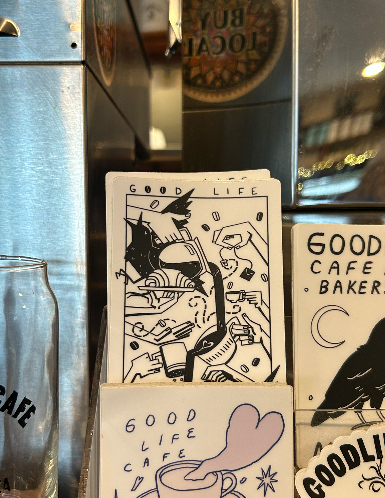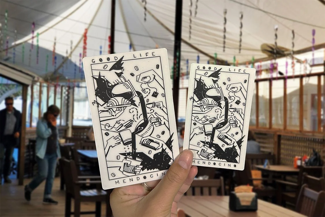 I illustrated a multipurpose design for a local bakery and cafe in the small town of Mendocino, The GoodLife Cafe. The design strives to capture the bustling, fast paced atmosphere, along with the somewhat chaotic and humorous energy of the neighborhood birds who patiently wait for customers to leave their food unattended. The design is displayed on various apparel/accessories throughout the establishment. I used Procreate to illustrate the final designs.